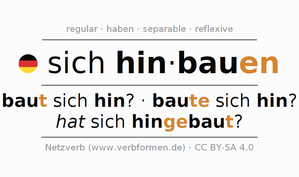 - Present: bau(e) (du) dir/dich hin, bau(e)n wir uns hin, baut (ihr) euch hin, bau(e)n Sie sich hin