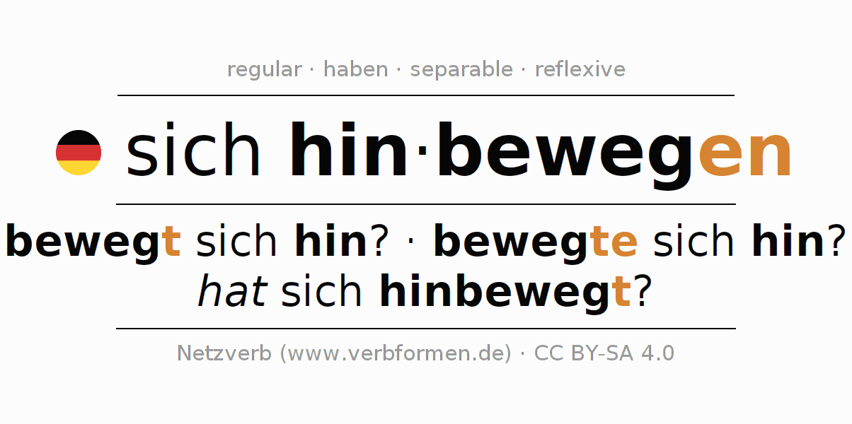- Future Perfect: werde ich mir/mich hinbewegt haben?, wirst du dir/dich hinbewegt haben?, wird er sich hinbewegt haben?, werden wir uns hinbewegt haben?, werdet ihr euch hinbewegt haben?, werden sie sich hinbewegt haben?
