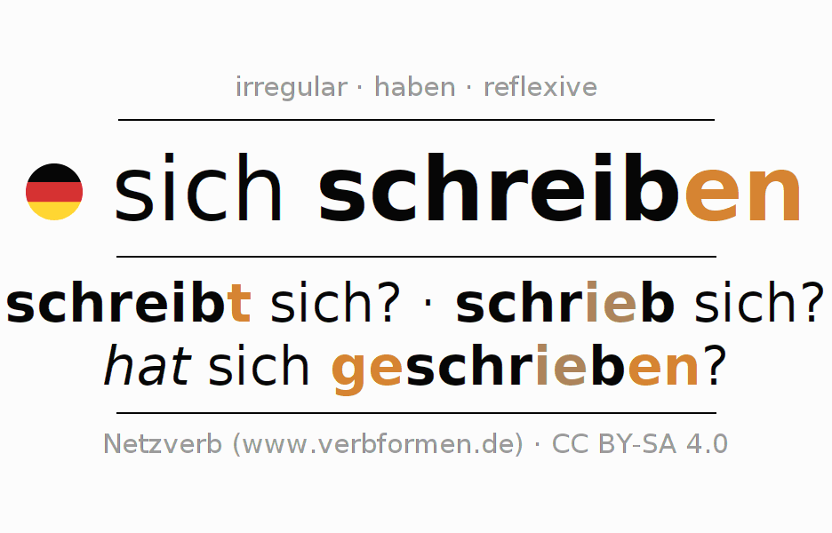 Clear online presentation of the verb 'sich schreiben' including all verb forms. Therfore, the flection of the verb sich schreiben can be useful for homework, tests, exams, German lessons in school, learning German, during studies and adult education. Especially for people learning German it is essential to know the correct flection of a verb (schreibt sich? - schrieb sich? - hat sich geschrieben?).