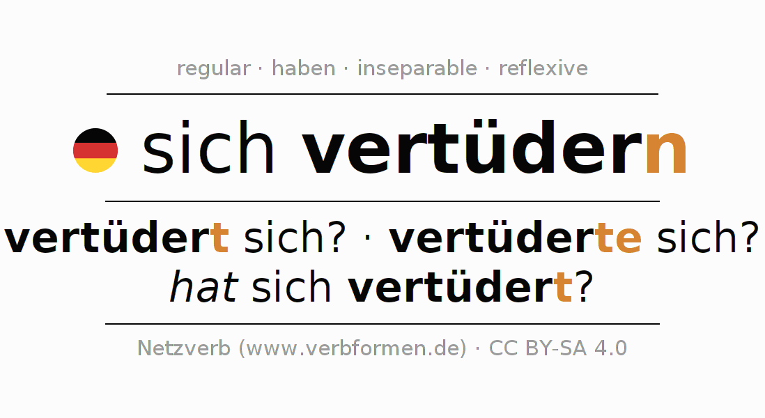 - Present: vertüd(e)r(e) (du) dir/dich, vertüdern wir uns, vertüdert (ihr) euch, vertüdern Sie sich