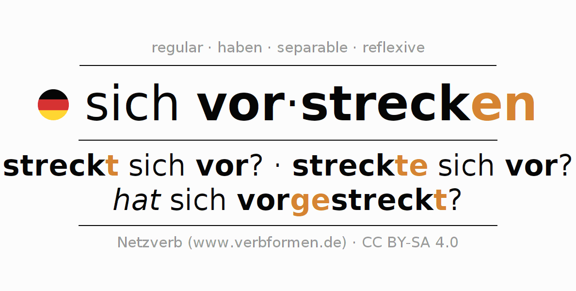 - Future: werde ich mir/mich vorstrecken?, werdest du dir/dich vorstrecken?, werde er sich vorstrecken?, werden wir uns vorstrecken?, werdet ihr euch vorstrecken?, werden sie sich vorstrecken?