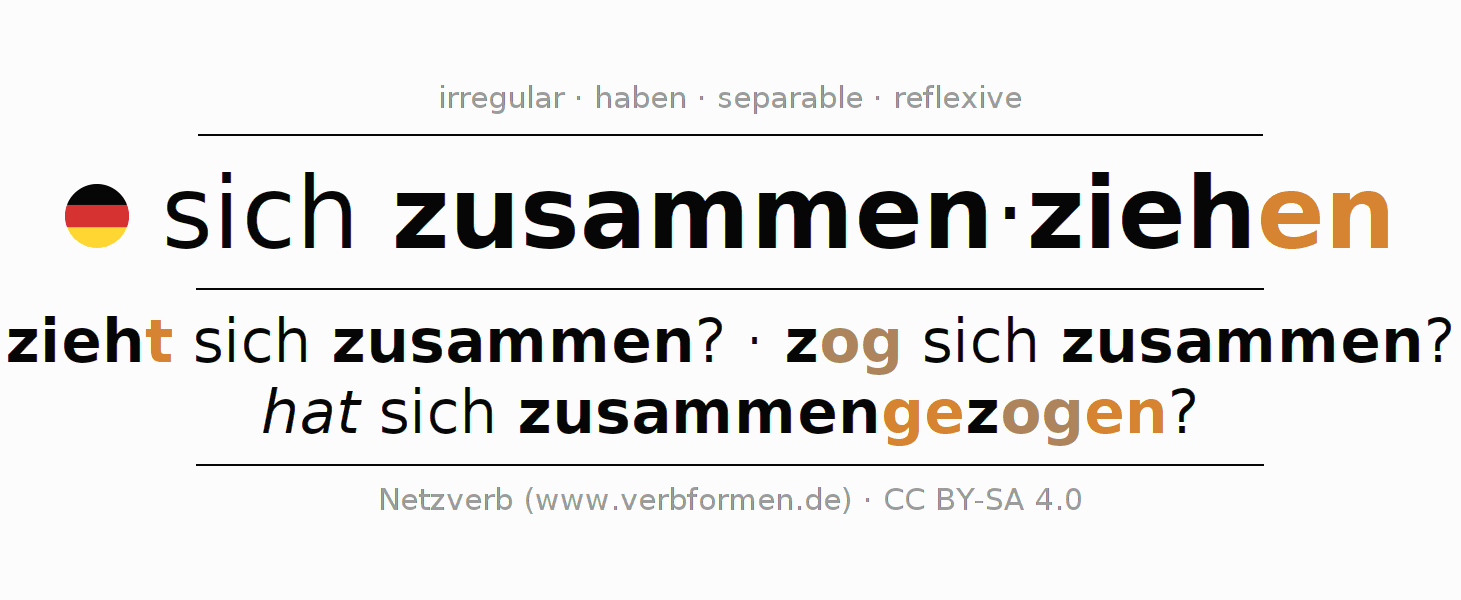 - Future Perfect: werde ich mir/mich zusammengezogen haben?, wirst du dir/dich zusammengezogen haben?, wird er sich zusammengezogen haben?, werden wir uns zusammengezogen haben?, werdet ihr euch zusammengezogen haben?, werden sie sich zusammengezogen haben?