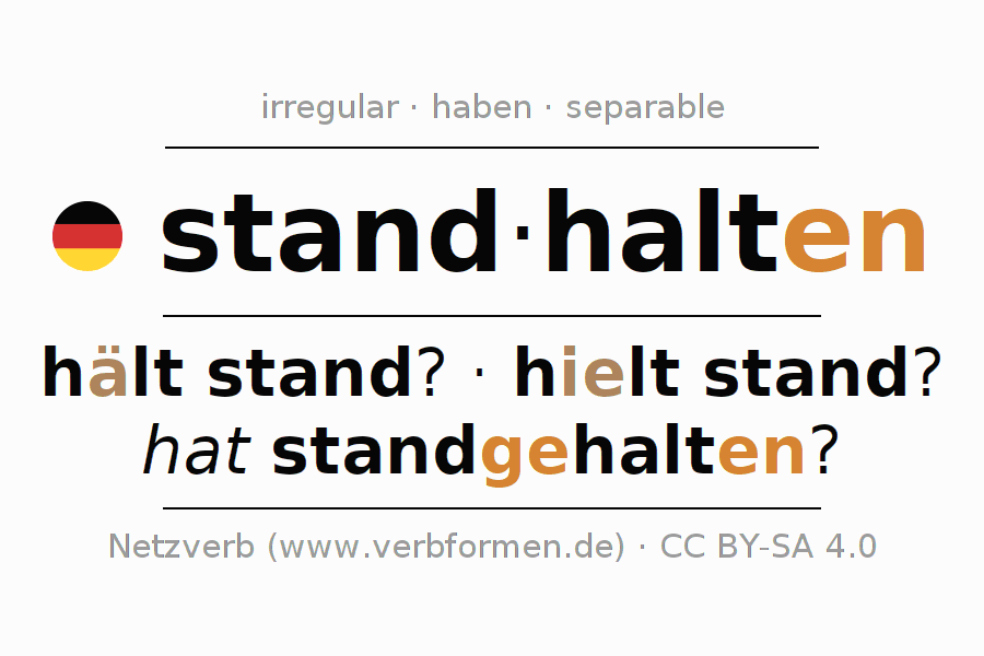 - Present: halt(e) (du) stand, halten wir stand, haltet (ihr) stand, halten Sie stand