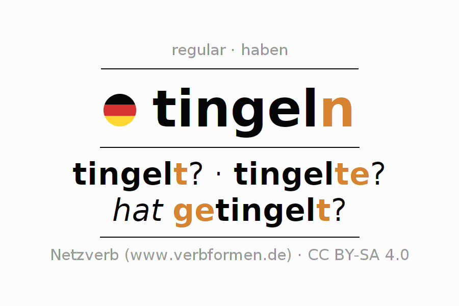 Clear online presentation of the verb 'tingeln' including all verb forms. Therfore, the flection of the verb tingeln can be useful for homework, tests, exams, German lessons in school, learning German, during studies and adult education. Especially for people learning German it is essential to know the correct flection of a verb (tingelt? - tingelte? - hat getingelt?).