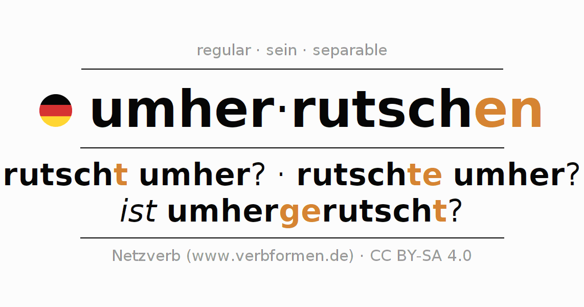 - Future: werde ich umherrutschen?, wirst du umherrutschen?, wird er umherrutschen?, werden wir umherrutschen?, werdet ihr umherrutschen?, werden sie umherrutschen?