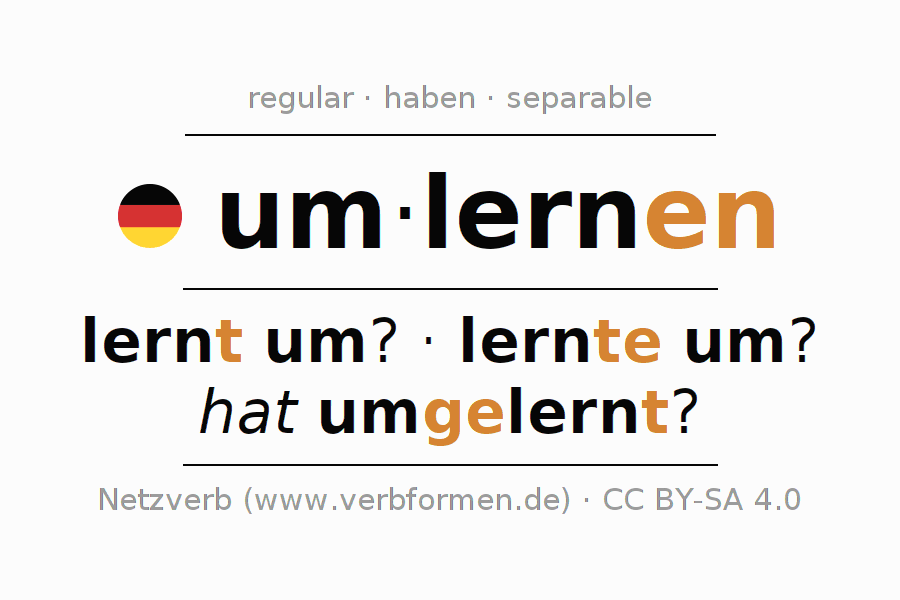 - Present: lern(e) (du) um, lernen wir um, lernt (ihr) um, lernen Sie um