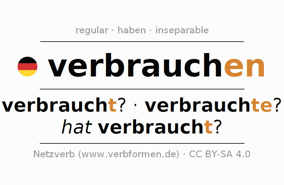 - Future: werde ich verbrauchen?, wirst du verbrauchen?, wird er verbrauchen?, werden wir verbrauchen?, werdet ihr verbrauchen?, werden sie verbrauchen?