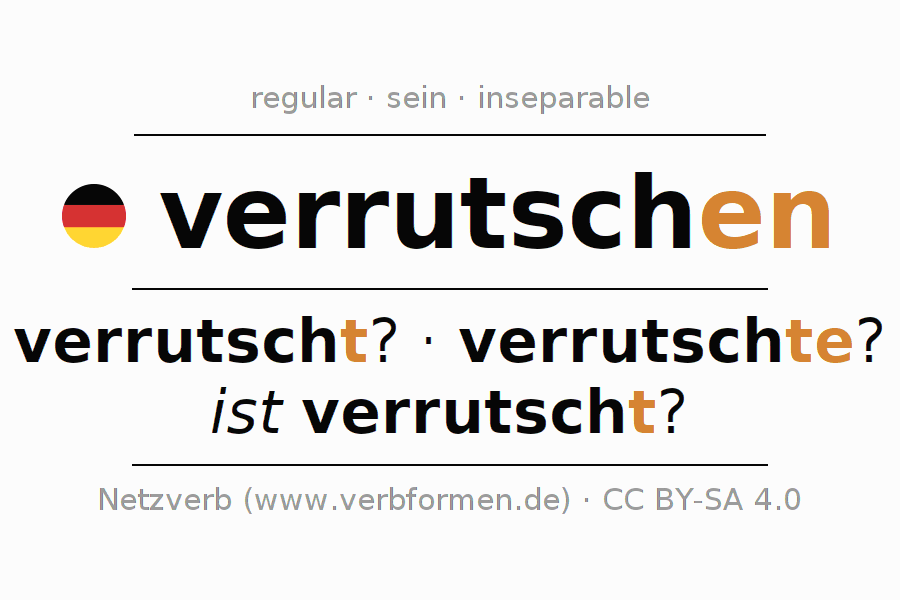 - Present: verrutsch(e) (du), verrutschen wir, verrutscht (ihr), verrutschen Sie