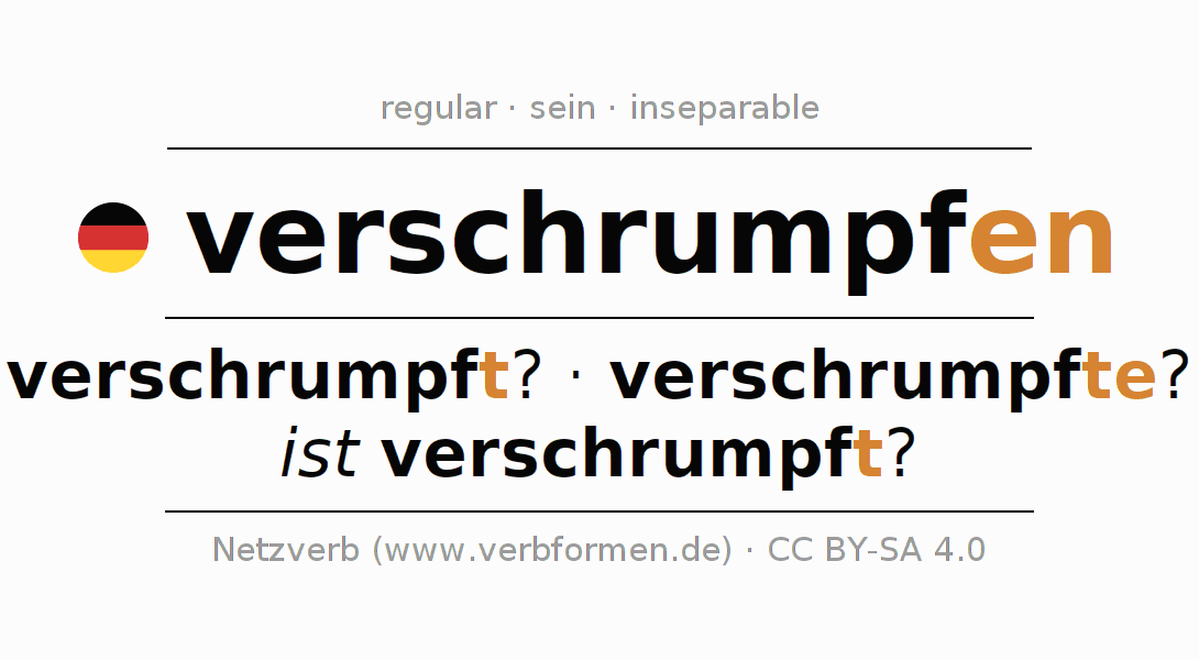 Clear online presentation of the verb 'verschrumpfen' including all verb forms. Therfore, the flection of the verb verschrumpfen can be useful for homework, tests, exams, German lessons in school, learning German, during studies and adult education. Especially for people learning German it is essential to know the correct flection of a verb (verschrumpft? - verschrumpfte? - ist verschrumpft?).