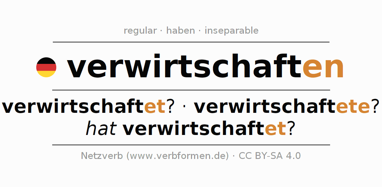 - Future: werde ich verwirtschaften?, wirst du verwirtschaften?, wird er verwirtschaften?, werden wir verwirtschaften?, werdet ihr verwirtschaften?, werden sie verwirtschaften?