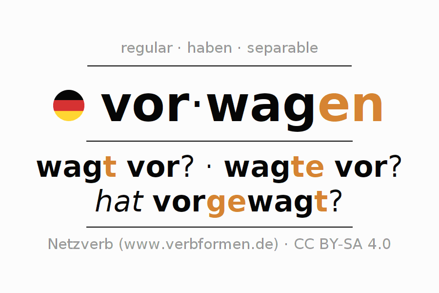 - Present: wag(e) (du) vor, wagen wir vor, wagt (ihr) vor, wagen Sie vor