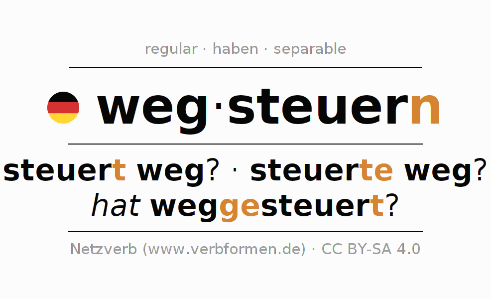 - Future: werde ich wegsteuern?, werdest du wegsteuern?, werde er wegsteuern?, werden wir wegsteuern?, werdet ihr wegsteuern?, werden sie wegsteuern?