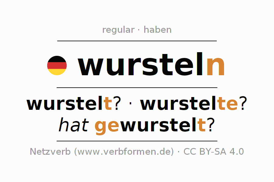 Clear online presentation of the verb 'wursteln' including all verb forms. Therfore, the flection of the verb wursteln can be useful for homework, tests, exams, German lessons in school, learning German, during studies and adult education. Especially for people learning German it is essential to know the correct flection of a verb (wurstelt? - wurstelte? - hat gewurstelt?).