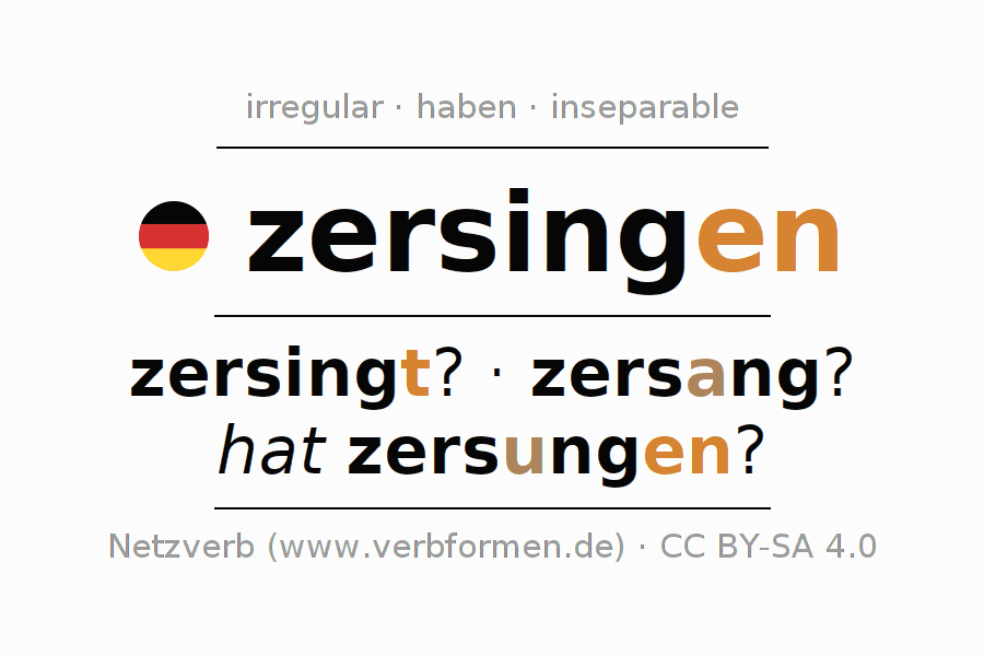 - Present: zersing(e) ich?, zersingst du?, zersingt er?, zersingen wir?, zersingt ihr?, zersingen sie?