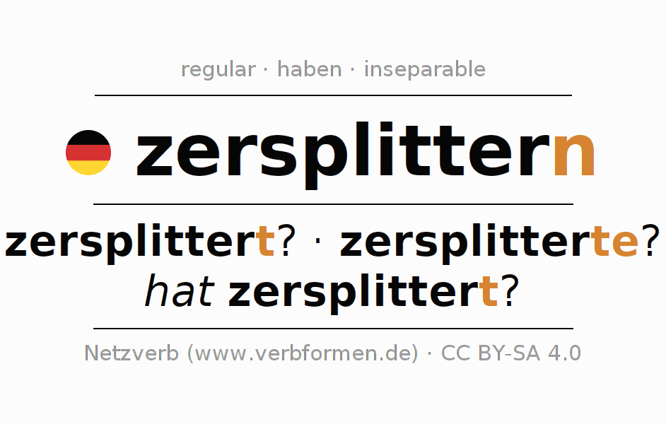 Clear online presentation of the verb 'zersplittern' including all verb forms. Therfore, the flection of the verb zersplittern can be useful for homework, tests, exams, German lessons in school, learning German, during studies and adult education. Especially for people learning German it is essential to know the correct flection of a verb (zersplittert? - zersplitterte? - hat zersplittert?).