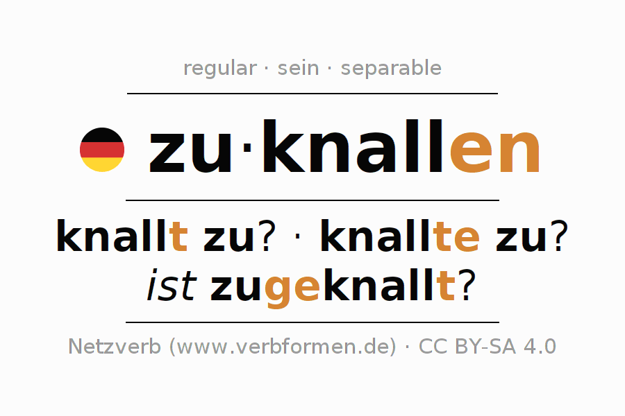 - Present: knall(e) (du) zu, knallen wir zu, knallt (ihr) zu, knallen Sie zu