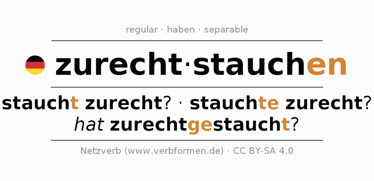 - Present: stauch(e) (du) zurecht, stauchen wir zurecht, staucht (ihr) zurecht, stauchen Sie zurecht
