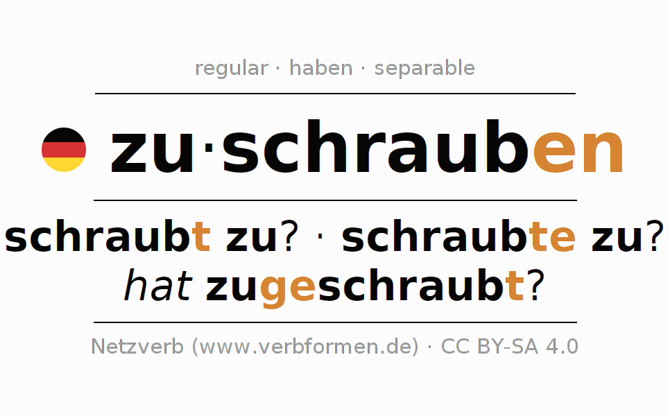 - Present: schraub(e) (du) zu, schrauben wir zu, schraubt (ihr) zu, schrauben Sie zu