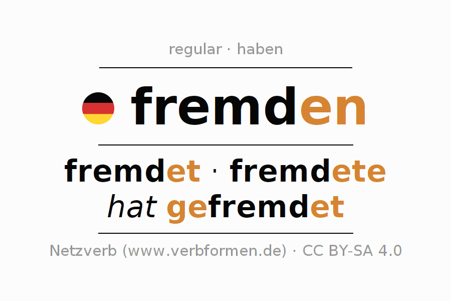Clear online presentation of the verb 'fremden' including all verb forms. Therfore, the flection of the verb fremden can be useful for homework, tests, exams, German lessons in school, learning German, during studies and adult education. Especially for people learning German it is essential to know the correct flection of a verb (fremdet - fremdete - hat gefremdet).