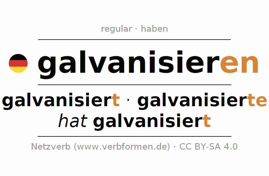 Clear online presentation of the verb 'galvanisieren' including all verb forms. Therfore, the flection of the verb galvanisieren can be useful for homework, tests, exams, German lessons in school, learning German, during studies and adult education. Especially for people learning German it is essential to know the correct flection of a verb (galvanisiert - galvanisierte - hat galvanisiert).