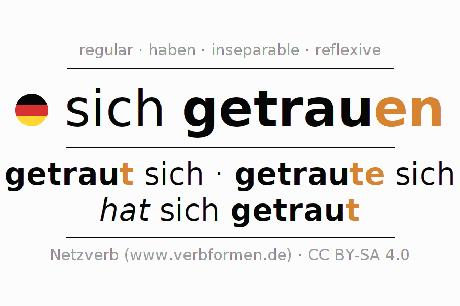 - Present: getrau(e) (du) dir/dich, getrau(e)n wir uns, getraut (ihr) euch, getrau(e)n Sie sich