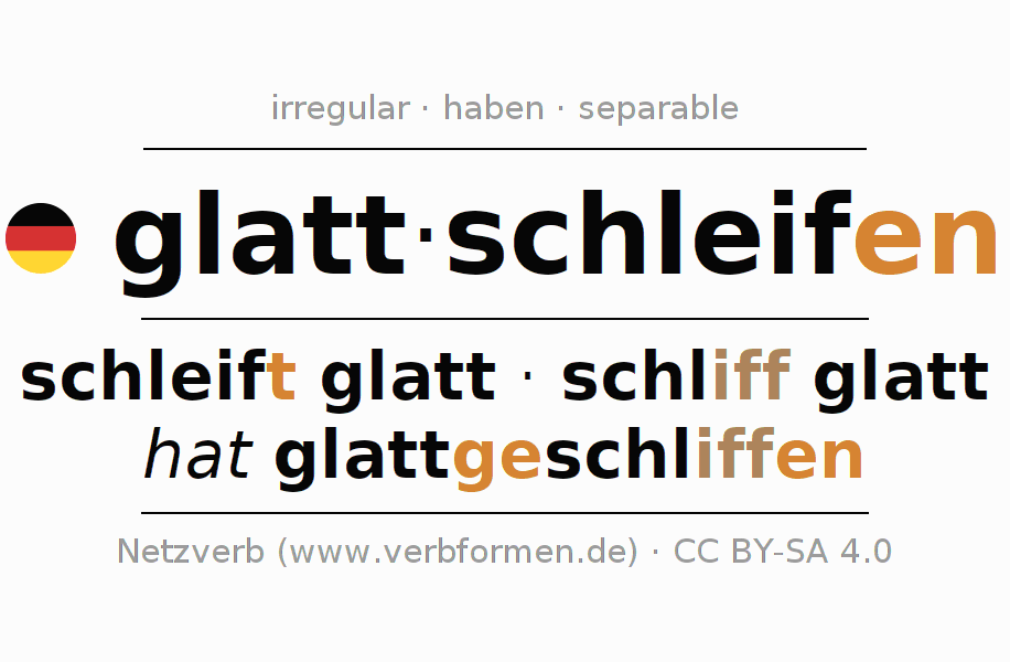 Clear online presentation of the verb 'glatt·schleifen' including all verb forms. Therfore, the flection of the verb glatt·schleifen can be useful for homework, tests, exams, German lessons in school, learning German, during studies and adult education. Especially for people learning German it is essential to know the correct flection of a verb (schleift glatt - schliff glatt - hat glattgeschliffen).
