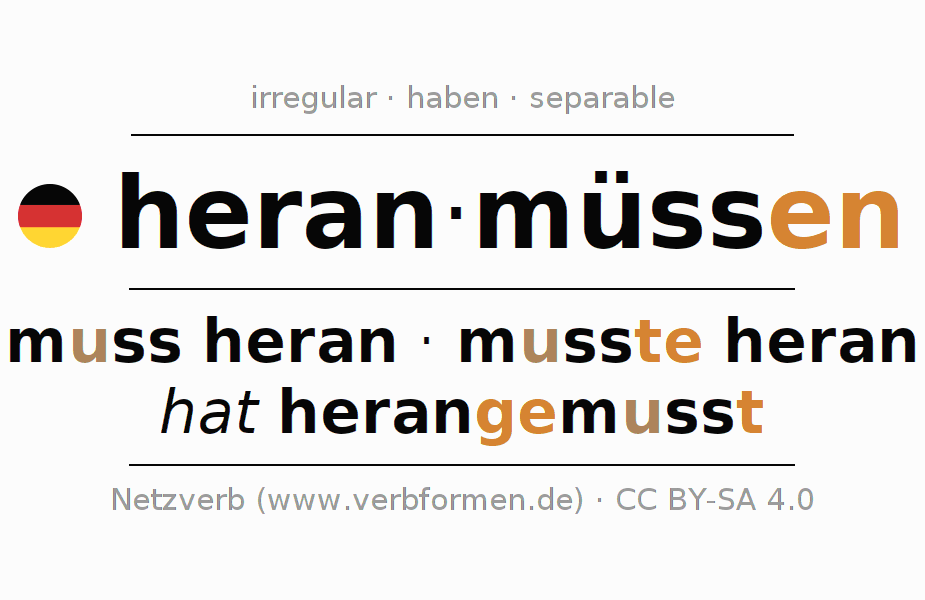 - Present: ich muss heran, du musst heran, er muss heran, wir müssen heran, ihr müsst heran, sie müssen heran
