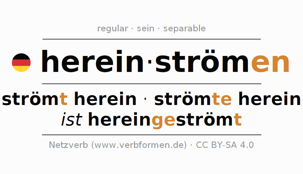 - Present: ström(e) (du) herein, strömen wir herein, strömt (ihr) herein, strömen Sie herein