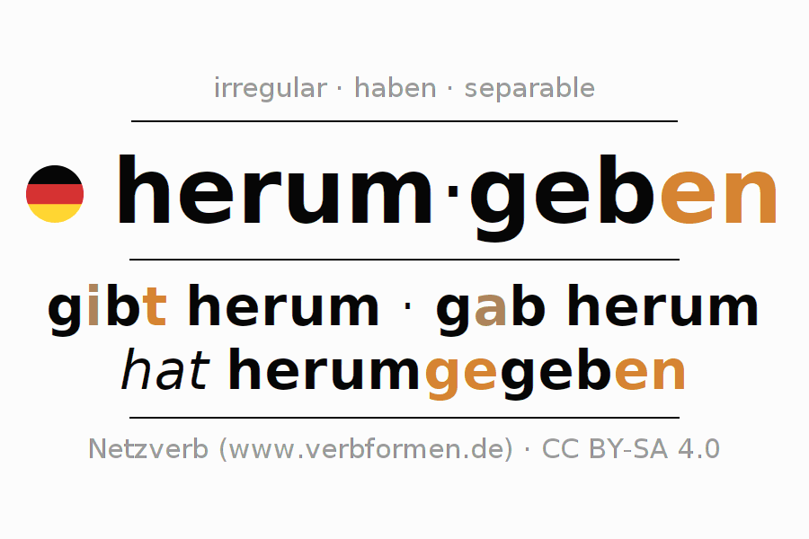 - Pluperfect: ich hatte herumgegeben, du hattest herumgegeben, er hatte herumgegeben, wir hatten herumgegeben, ihr hattet herumgegeben, sie hatten herumgegeben