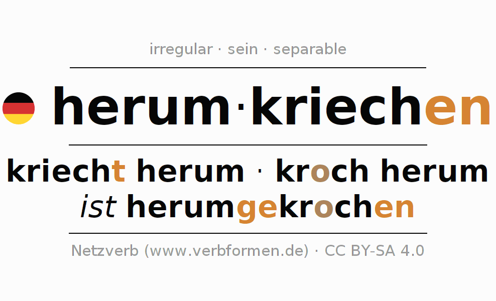 Clear online presentation of the verb 'herum·kriechen' including all verb forms. Therfore, the flection of the verb herum·kriechen can be useful for homework, tests, exams, German lessons in school, learning German, during studies and adult education. Especially for people learning German it is essential to know the correct flection of a verb (kriecht herum - kroch herum - ist herumgekrochen).
