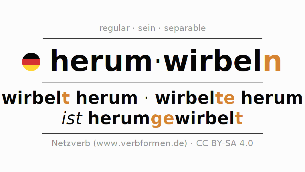 Clear online presentation of the verb 'herum·wirbeln' including all verb forms. Therfore, the flection of the verb herum·wirbeln can be useful for homework, tests, exams, German lessons in school, learning German, during studies and adult education. Especially for people learning German it is essential to know the correct flection of a verb (wirbelt herum - wirbelte herum - ist herumgewirbelt).