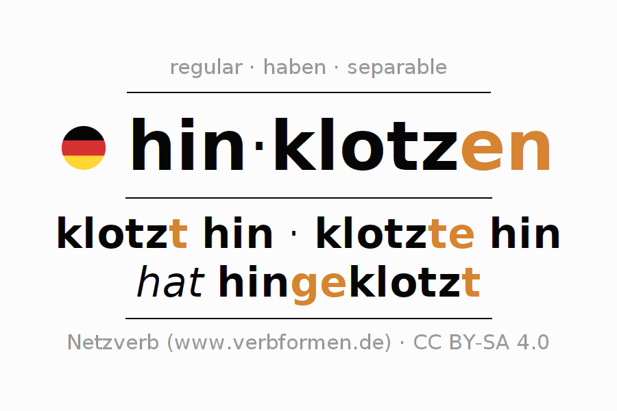 - Present: klotz(e) (du) hin, klotzen wir hin, klotzt (ihr) hin, klotzen Sie hin