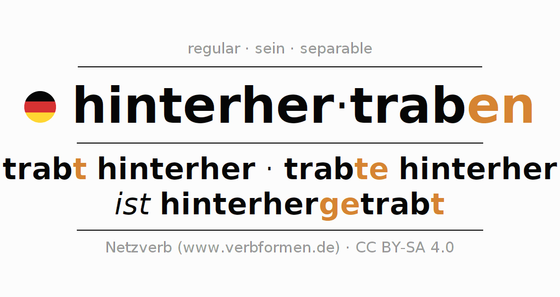- Present: trab(e) (du) hinterher, traben wir hinterher, trabt (ihr) hinterher, traben Sie hinterher