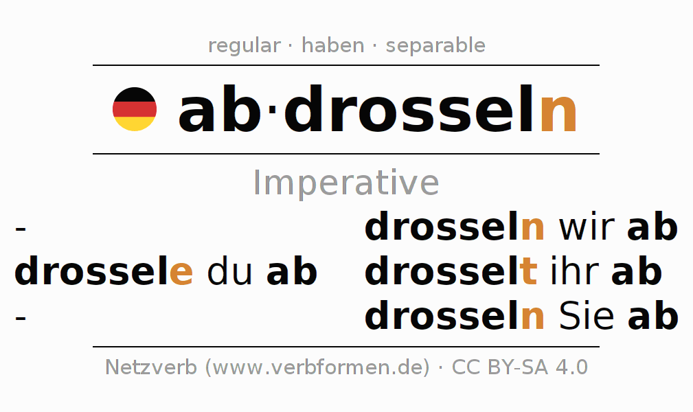 The conjugation of abdrosseln (throttle, choke) in the imperative is: dross(e)le (du) ab, drosseln wir ab, drosselt (ihr) ab, drosseln Sie ab. The imperative is formed with the stem of present tense drossel. The endings -e, -n, -t, -n are appended to the stem. The endings in the 1st and 3rd person plural are shortened by e, since the verb ends with -ern. The prefix ab- of abdrosseln is separated.The personal pronoun is usually omitted in the 2nd person singular.The formation of the forms corresponds to the grammatical rules for the conjugation of the verbs in imperative. Comments ☆