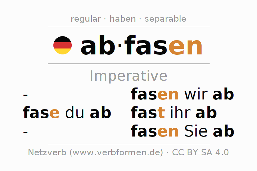 The conjugation of abfasen (chamfer, bevel) in the imperative is: fase (du) ab, fasen wir ab, fast (ihr) ab, fasen Sie ab. The imperative is formed with the stem of present tense fas. The endings -e, -en, -t, -en are appended to the stem. The prefix ab- of abfasen is separated.The personal pronoun is usually omitted in the 2nd person singular.The formation of the forms corresponds to the grammatical rules for the conjugation of the verbs in imperative. Comments ☆
