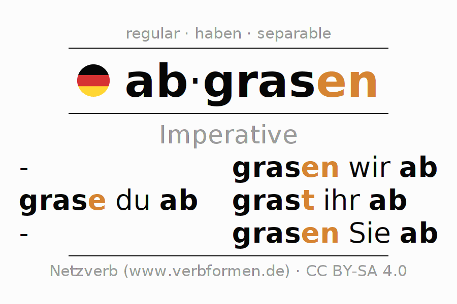 The conjugation of abgrasen (browse, graze) in the imperative is: grase (du) ab, grasen wir ab, grast (ihr) ab, grasen Sie ab. The imperative is formed with the stem of present tense gras. The endings -e, -en, -t, -en are appended to the stem. The prefix ab- of abgrasen is separated.The personal pronoun is usually omitted in the 2nd person singular.The formation of the forms corresponds to the grammatical rules for the conjugation of the verbs in imperative. Comments ☆