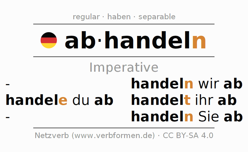 The conjugation of abhandeln (discuss, address) in the imperative is: hand(e)le (du) ab, handeln wir ab, handelt (ihr) ab, handeln Sie ab. The imperative is formed with the stem of present tense handel. The endings -e, -n, -t, -n are appended to the stem. The endings in the 1st and 3rd person plural are shortened by e, since the verb ends with -ern. The prefix ab- of abhandeln is separated.The personal pronoun is usually omitted in the 2nd person singular.The formation of the forms corresponds to the grammatical rules for the conjugation of the verbs in imperative. Comments ☆