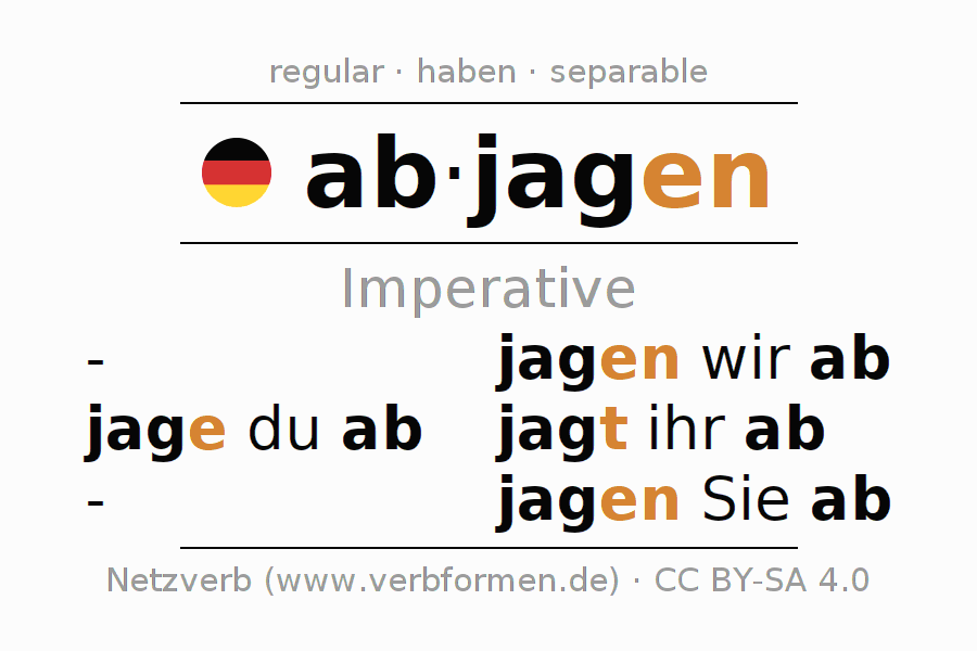 The conjugation of abjagen (snatch, chase) in the imperative is: jage (du) ab, jagen wir ab, jagt (ihr) ab, jagen Sie ab. The imperative is formed with the stem of present tense jag. The endings -e, -en, -t, -en are appended to the stem. The prefix ab- of abjagen is separated.The personal pronoun is usually omitted in the 2nd person singular.The formation of the forms corresponds to the grammatical rules for the conjugation of the verbs in imperative. Comments ☆