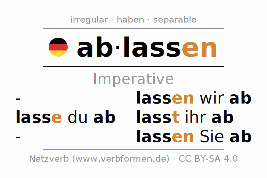 The conjugation of ablassen (release, let go) in the imperative is: lasse (du) ab, lassen wir ab, lasst (ihr) ab, lassen Sie ab. The imperative is formed with the stem of present tense lass. The endings -e, -en, -t, -en are appended to the stem. The prefix ab- of ablassen is separated.The personal pronoun is usually omitted in the 2nd person singular.The formation of the forms corresponds to the grammatical rules for the conjugation of the verbs in imperative. Comments ☆