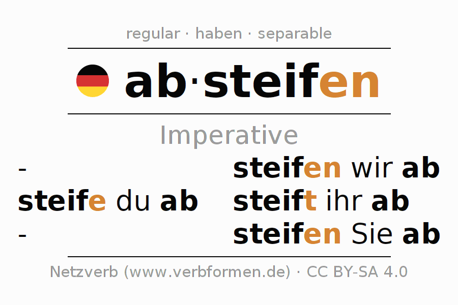 The conjugation of absteifen (stiffen, brace) in the imperative is: steife (du) ab, steifen wir ab, steift (ihr) ab, steifen Sie ab. The imperative is formed with the stem of present tense steif. The endings -e, -en, -t, -en are appended to the stem. The prefix ab- of absteifen is separated.The personal pronoun is usually omitted in the 2nd person singular.The formation of the forms corresponds to the grammatical rules for the conjugation of the verbs in imperative. Comments ☆