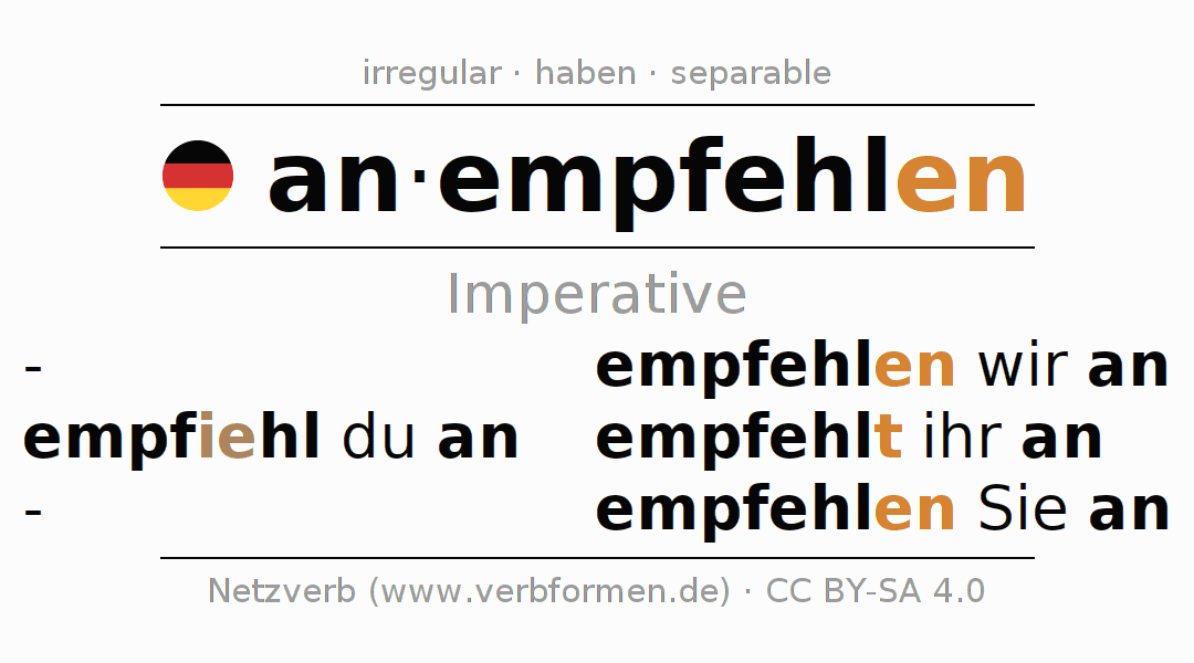 The conjugation of anempfehlen (commend, recommend) in the imperative is: empfiehl (du) an, empfehlen wir an, empfehlt (ihr) an, empfehlen Sie an. The imperative is formed with the stem of present tense fehl. As an irregular verb there is the changed stem fiehl in the second person singular. The endings -, -en, -t, -en are appended to the stem. The ending of the 2nd person singular has been shortened by one e, as the stem ends on e. The prefix an- of anempfehlen is separated.The personal pronoun is usually omitted in the 2nd person singular.The formation of the forms corresponds to the grammatical rules for the conjugation of the verbs in imperative. Comments ☆