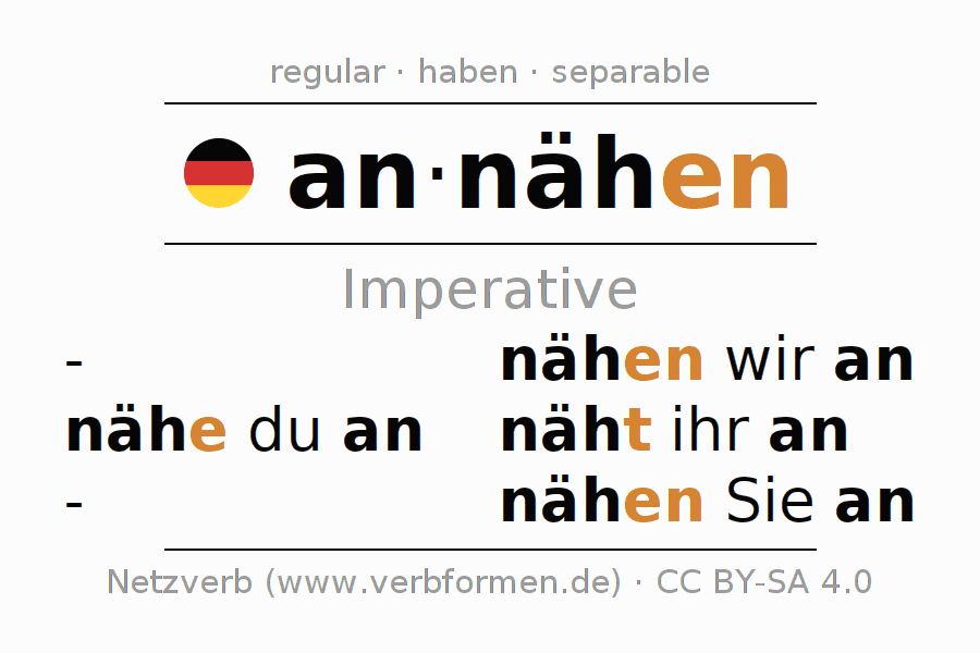 The conjugation of annähen (attach, sew) in the imperative is: nähe (du) an, nähen wir an, näht (ihr) an, nähen Sie an. The imperative is formed with the stem of present tense näh. The endings -e, -en, -t, -en are appended to the stem. The prefix an- of annähen is separated.The personal pronoun is usually omitted in the 2nd person singular.The formation of the forms corresponds to the grammatical rules for the conjugation of the verbs in imperative. Comments ☆