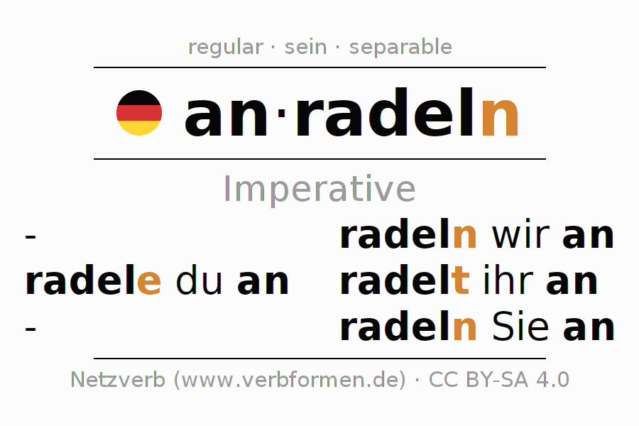 The conjugation of anradeln (approach by bike, cycle against resistance) in the imperative is: rad(e)le (du) an, radeln wir an, radelt (ihr) an, radeln Sie an. The imperative is formed with the stem of present tense radel. The endings -e, -n, -t, -n are appended to the stem. The endings in the 1st and 3rd person plural are shortened by e, since the verb ends with -ern. The prefix an- of anradeln is separated.The personal pronoun is usually omitted in the 2nd person singular.The formation of the forms corresponds to the grammatical rules for the conjugation of the verbs in imperative. Comments ☆