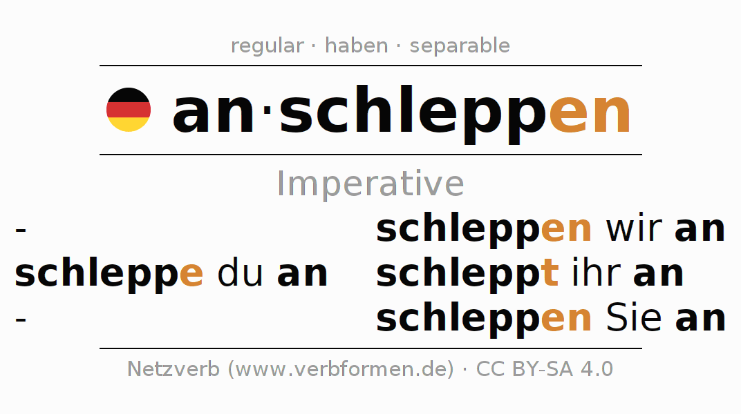 The conjugation of anschleppen (bring along, drag) in the imperative is: schleppe (du) an, schleppen wir an, schleppt (ihr) an, schleppen Sie an. The imperative is formed with the stem of present tense schlepp. The endings -e, -en, -t, -en are appended to the stem. The prefix an- of anschleppen is separated.The personal pronoun is usually omitted in the 2nd person singular.The formation of the forms corresponds to the grammatical rules for the conjugation of the verbs in imperative. Comments ☆