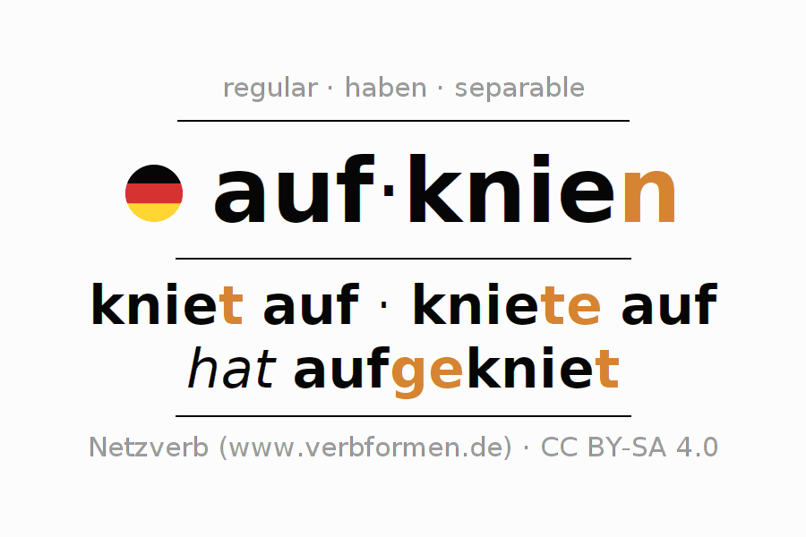The conjugation of aufknien (kneel, kneeling) in the imperative is: knie (du) auf, knien wir auf, kniet (ihr) auf, knien Sie auf. The imperative is formed with the stem of present tense knie. The endings -, -n, -t, -n are appended to the stem. The ending of the 2nd person singular has been shortened by one e, as the stem ends on e. The prefix auf- of aufknien is separated.The personal pronoun is usually omitted in the 2nd person singular.The formation of the forms corresponds to the grammatical rules for the conjugation of the verbs in imperative. Comments ☆
