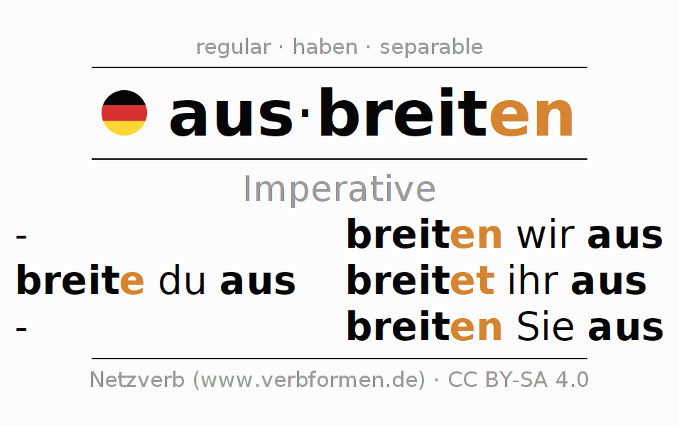 The conjugation of ausbreiten (spread, spread out) in the imperative is: breite (du) aus, breiten wir aus, breitet (ihr) aus, breiten Sie aus. The imperative is formed with the stem of present tense breit. The endings -e, -en, -et, -en are appended to the stem. The ending of the 2nd Person Singular is extended by an e, as the stem ends in t. The prefix aus- of ausbreiten is separated.The personal pronoun is usually omitted in the 2nd person singular.The formation of the forms corresponds to the grammatical rules for the conjugation of the verbs in imperative. Comments ☆