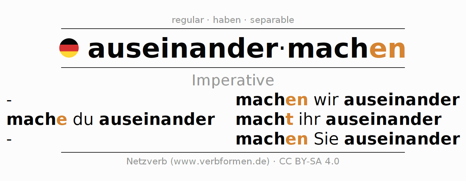 The conjugation of auseinandermachen (spread apart, take apart) in the imperative is: mache (du) auseinander, machen wir auseinander, macht (ihr) auseinander, machen Sie auseinander. The imperative is formed with the stem of present tense mach. The endings -e, -en, -t, -en are appended to the stem. The prefix auseinander- of auseinandermachen is separated.The personal pronoun is usually omitted in the 2nd person singular.The formation of the forms corresponds to the grammatical rules for the conjugation of the verbs in imperative. Comments ☆