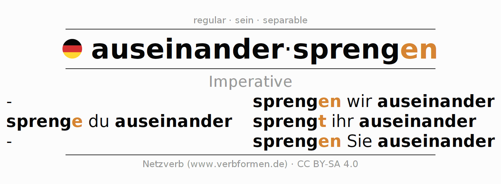 The conjugation of auseinandersprengen (blast apart, blow apart) in the imperative is: sprenge (du) auseinander, sprengen wir auseinander, sprengt (ihr) auseinander, sprengen Sie auseinander. The imperative is formed with the stem of present tense spreng. The endings -e, -en, -t, -en are appended to the stem. The prefix auseinander- of auseinandersprengen is separated.The personal pronoun is usually omitted in the 2nd person singular.The formation of the forms corresponds to the grammatical rules for the conjugation of the verbs in imperative. Comments ☆