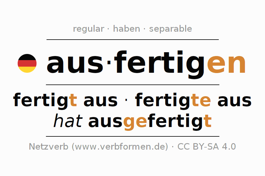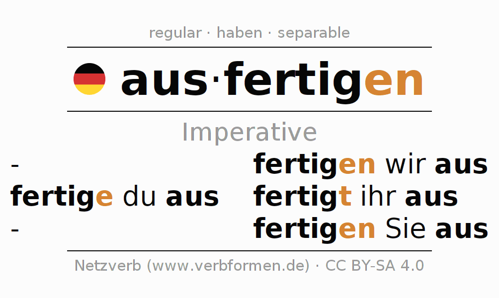 The conjugation of ausfertigen (issue, draft) in the imperative is: fertige (du) aus, fertigen wir aus, fertigt (ihr) aus, fertigen Sie aus. The imperative is formed with the stem of present tense fertig. The endings -e, -en, -t, -en are appended to the stem. The prefix aus- of ausfertigen is separated.The personal pronoun is usually omitted in the 2nd person singular.The formation of the forms corresponds to the grammatical rules for the conjugation of the verbs in imperative. Comments ☆