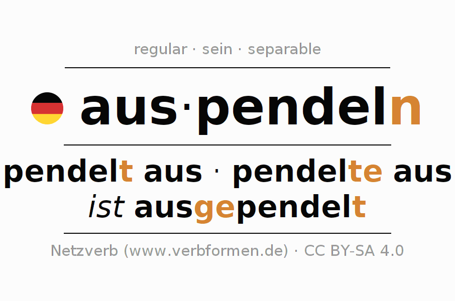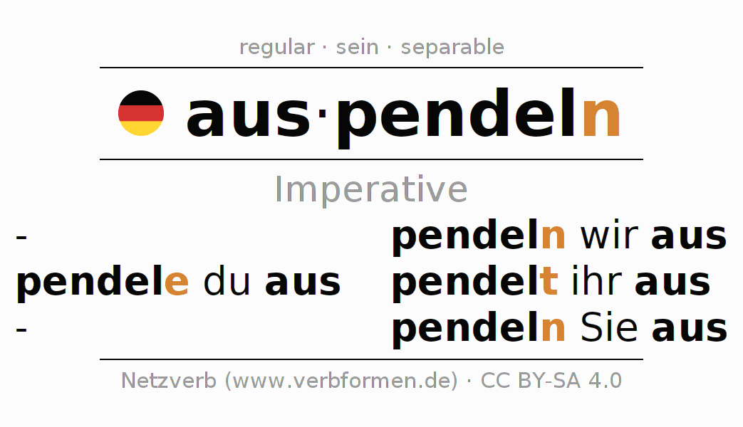 The conjugation of auspendeln (oscillate, cease swinging) in the imperative is: pend(e)le (du) aus, pendeln wir aus, pendelt (ihr) aus, pendeln Sie aus. The imperative is formed with the stem of present tense pendel. The endings -e, -n, -t, -n are appended to the stem. The endings in the 1st and 3rd person plural are shortened by e, since the verb ends with -ern. The prefix aus- of auspendeln is separated.The personal pronoun is usually omitted in the 2nd person singular.The formation of the forms corresponds to the grammatical rules for the conjugation of the verbs in imperative. Comments ☆